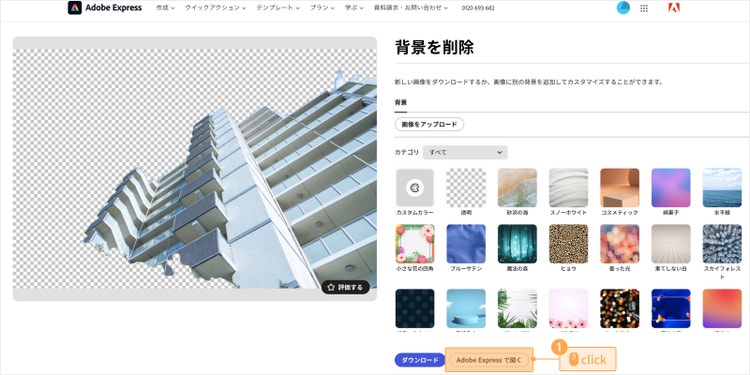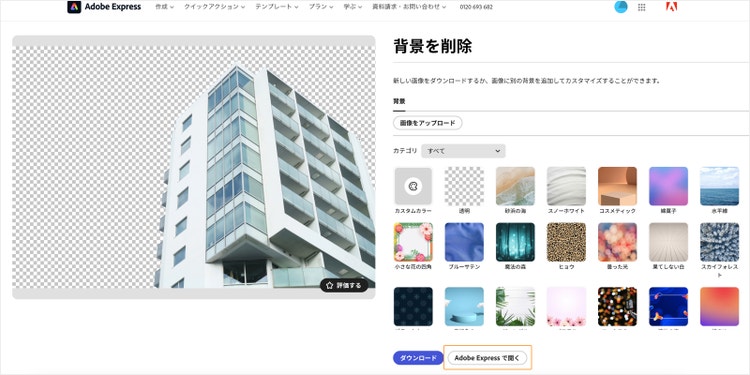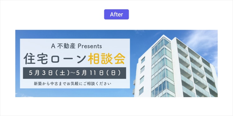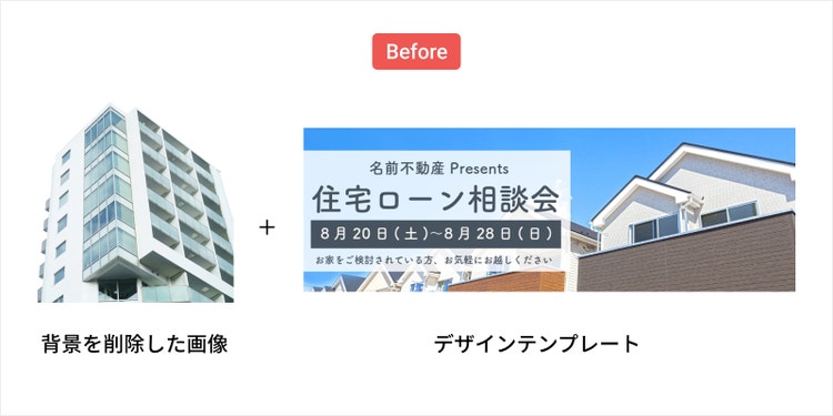 例えば、背景を削除した建物の写真と、Adobe Expressのテンプレートや素材を組み合わせるだけで、カンタンにバナーの作成が可能です。