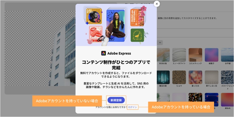 なお、Adobe Expressにログインしていない場合、「ダウンロード」をクリックすると以下の画面が表示されます。