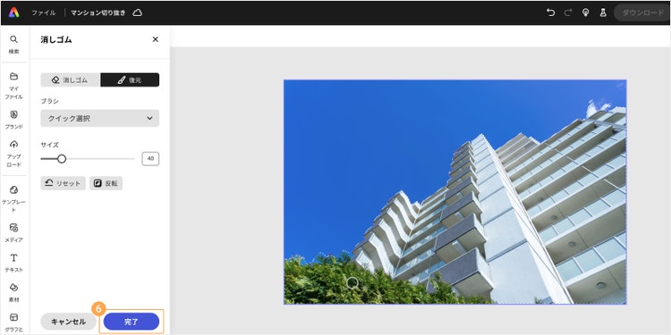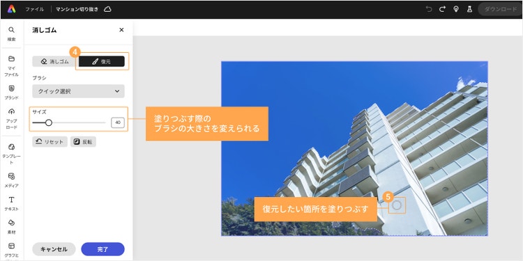 用途に応じて、画面左上の「消しゴム」もしくは「復元」を選びます。