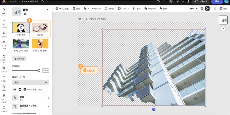 なお、切り抜いた写真に余分な箇所が残っていたり、必要な箇所まで削除されてしまったりした場合は「Adobe Expressで開く」をクリックして編集画面に移動しましょう。