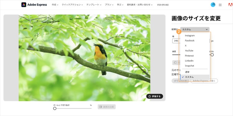 画面右側の「サイズ変更」から、InstagramやYouTubeなど用途にあわせてトリミング後の画像サイズを選んでください。任意のサイズでトリミングしたい場合は、「カスタム」を選ぶとサイズを数値で指定できます。