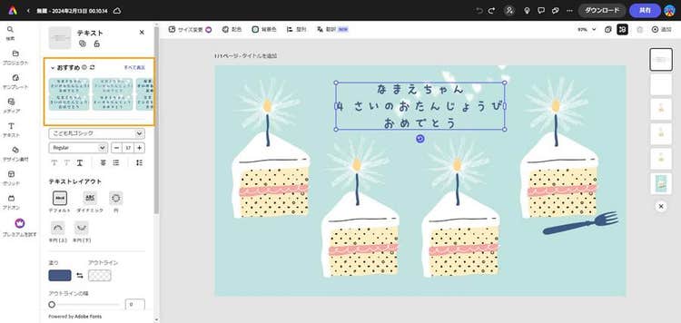 そのほか、Adobe Expressの編集画面には、オススメのフォントを紹介してくれる便利な機能があります。