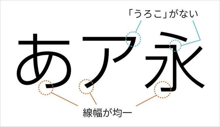 ゴシック体は、線幅に変化がなく、明朝体に見られる「うろこ」のような装飾や、「はね」や「はらい」がありません。