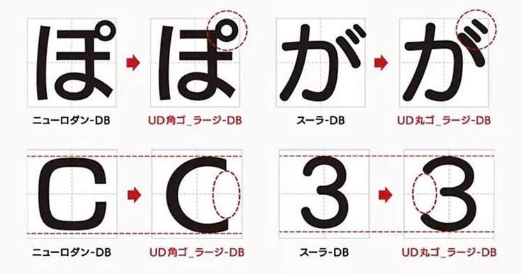 濁点や半濁点を大きくしたり、文字内の空間(ふところ)を広げたりといった工夫によって、見やすく読みやすいフォントになっているのです。