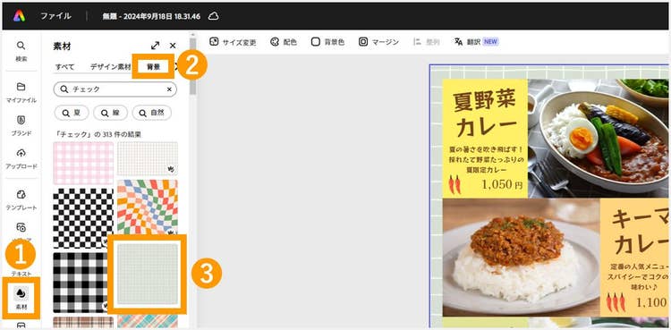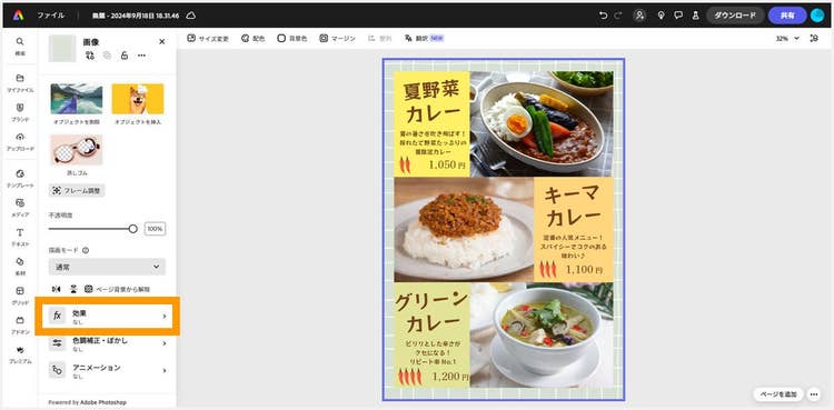 Adobe Expressでテンプレートを編集し、さっそくメニュー表をデザインしてみましょう。ここではPCでの手順をご紹介しますが、Adobe Expressのアプリを使えばスマホやタブレットでもデザインできます。