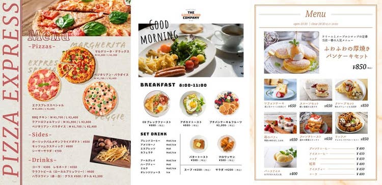 飲食店のメニュー表は、料理の品名と写真、価格が一目で理解できるように整理することが大切です。また、料理の説明文を添えて魅力を伝えるのもよいでしょう。