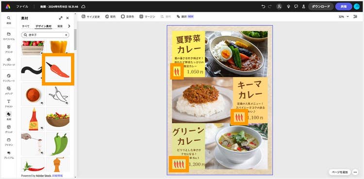 次に、新しく素材を追加する方法を解説します。今回は、唐辛子で辛さを表現してみます。画面左側の「素材」を選択すると、イメージ画像を検索できます。