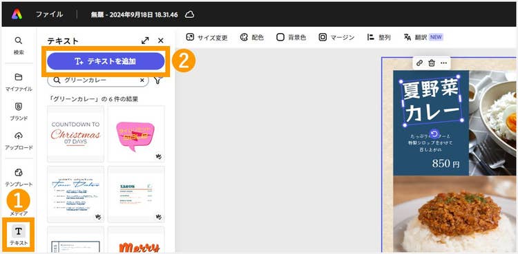 テンプレート内のテキストを変更するのではなく、新たにテキストボックスを配置したい場合は、ツールバーの「テキスト」→「テキストを追加」をクリックしてください。