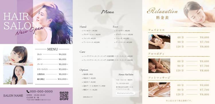 美容室やネイルサロン、エステサロンなどの店舗にとって、メニュー表は重要な販促ツールです。お客さまがウェブやチラシで既にメニューを確認していても、あらためてメニュー表を通してご案内することも少なくありません。また、店舗のコンセプトに合わせたデザインにすることで、店舗の世界観を表現できます。