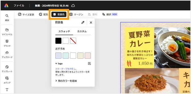 上部の「背景色」をクリックすると、背景色の編集ツールが表示されます。メニュー表のイメージに合う背景色を設定しましょう。「おすすめ」の色から選んだり、「カスタム」や「別のカラーを追加」で色を指定したりできます。