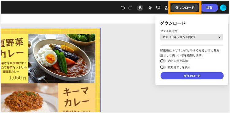 デザインが完成したら、画面右上の「ダウンロード」ボタンをクリックし、ファイル形式を選んで画像をダウンロードしましょう。印刷をする場合は、デザインが崩れにくいPDFファイルを選ぶのがオススメです。