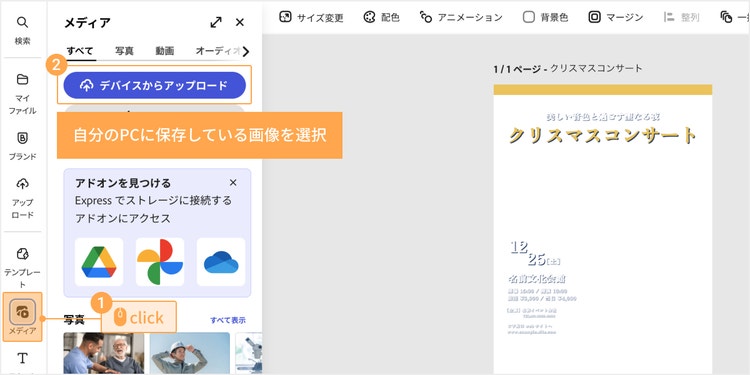 次に、自分のPCに保存している画像を使う場合は、画面左側の「メディア」を選択し、「デバイスからアップロード」をクリックして画像をアップロードします。