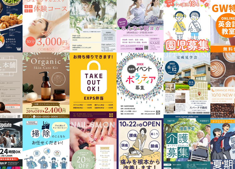 そんなときは、デザインテンプレートを使うのがオススメです。たとえば、無料のデザインツール「Adobe Express」なら、プロがデザインした豊富なテンプレートを使えます。デザインの知識は不要で、訴求力が高くておしゃれなチラシ・フライヤーを簡単に作成できるので、ぜひお試しください。