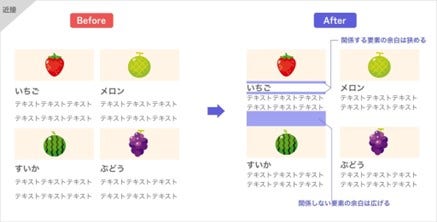 「近接」とは、関連する情報を近づけてグルーピングすることです。人は「位置が近いもの同士は関連性が強い」と認識するので、グループ化すると情報の構成が視覚的にわかりやすくなります。