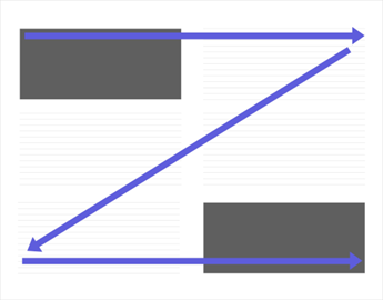 人はチラシやポスターなどの紙媒体を見る際、横書きの製作物であれば「Z」を描くようにして視線を動かす法則があります。そのため、とくに重点的に伝えたい内容は、チラシの左上部に配置するとよいでしょう。