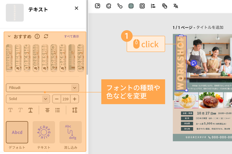 画面左側からはフォントの種類や色などを変更でき、テンプレートの雰囲気に合うオススメフォントを教えてくれる機能も用意されています。様々なフォントを試しながら、ワークショップのイメージにぴったりなものを選びましょう。