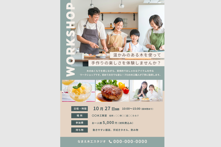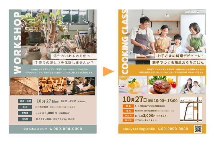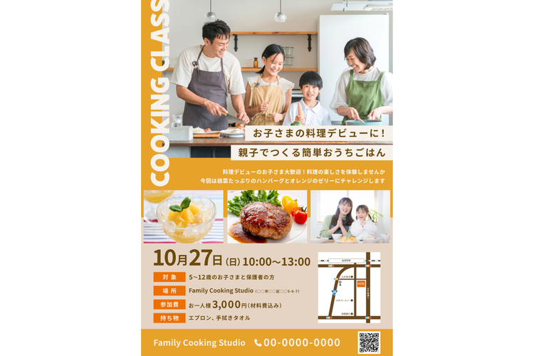 そこで今回は「親子向けの料理教室」を例に、集客効果の高いワークショップのチラシをデザインするためのポイントを解説します。
