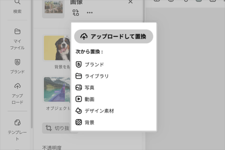 - 手持ちの画像を使う場合:「アップロードして置換」から画像を選択