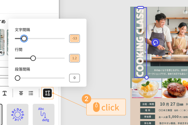 今回は、タイトルテキストを「COOKING CLASS」に変更したほか、テキストがキレイに収まるよう以下を調整しています。