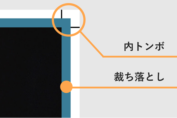 「内トンボを追加」「裁ち落としを表示」のスイッチをクリックしてオンにすると、PDF形式でダウンロードした際、以下のような表示が入ります。印刷後のトリミングがカンタンになるので、ぜひ設定してみてください。