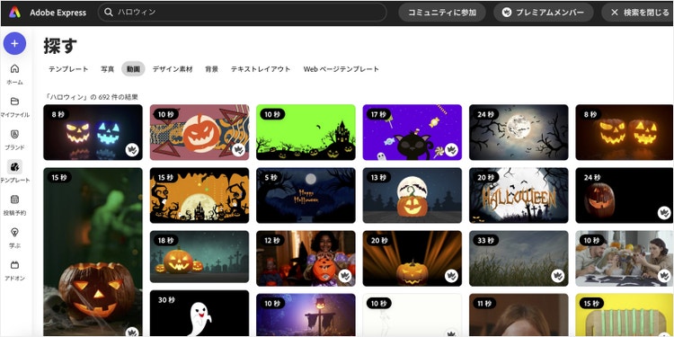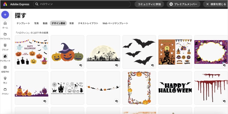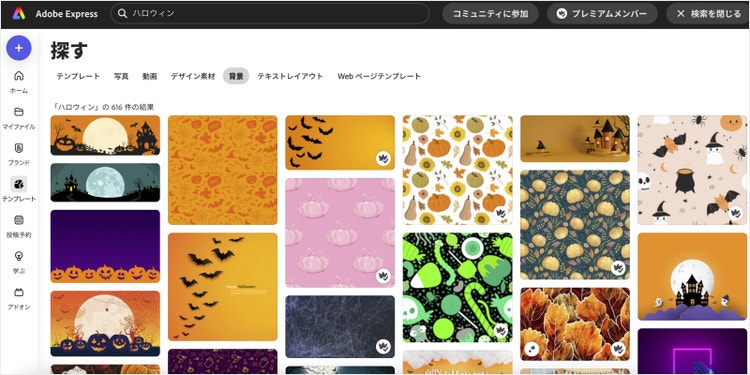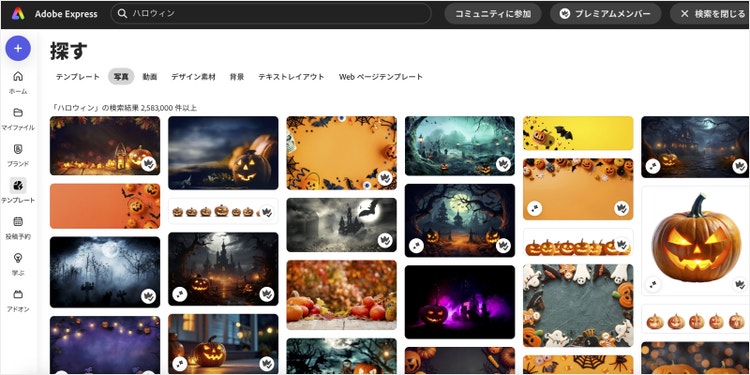 Adobe Expressには、テンプレート以外にも、ハロウィンに使えるデザイン素材が豊富に揃っています。「写真」「イラスト」「背景」「動画」の種類別にご紹介しますので、作りたいイメージに合ったものを探してみてください。