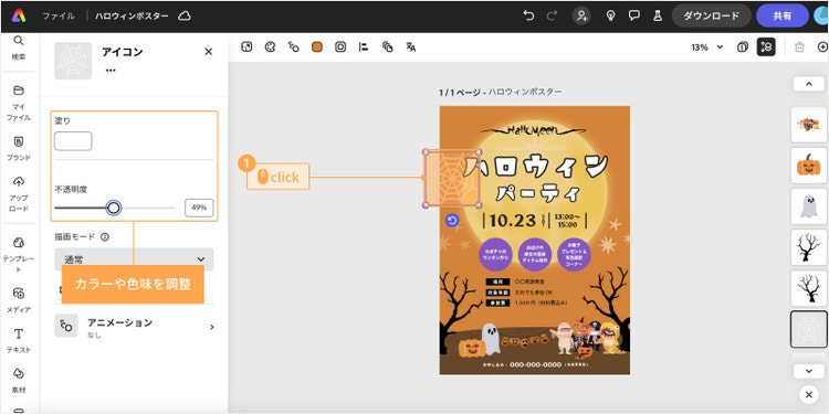 デザイン素材のカラーや不透明度もカンタンに変えられます。変更したいイラストをクリックして、ツールバーの「塗り」ボタンでカラーを変更したり、「不透明度」で色味を調整したりしましょう。