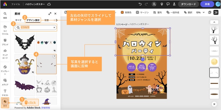 気に入った写真素材が見つかったら、早速ハロウィンのデザインを作成してみましょう。