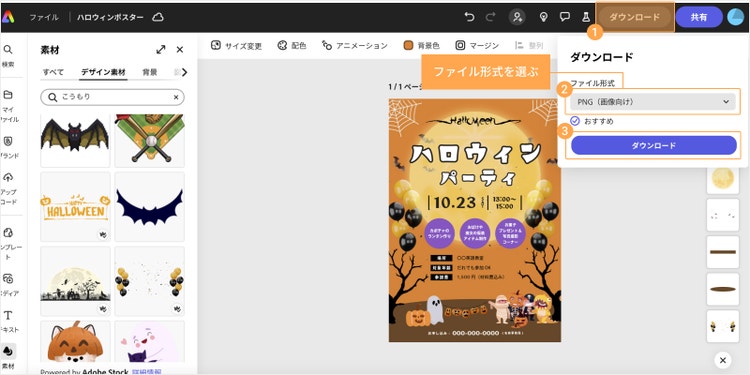デザインが完成したら、画面右上の「ダウンロード」からファイルタイプを選択し、ファイルをダウンロードします。