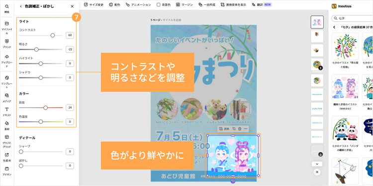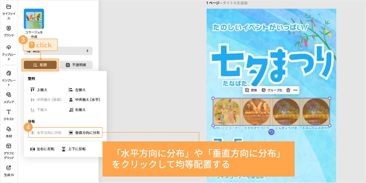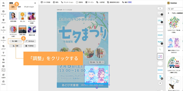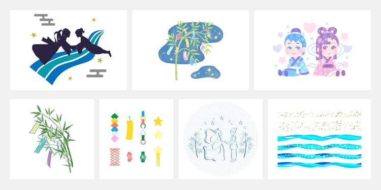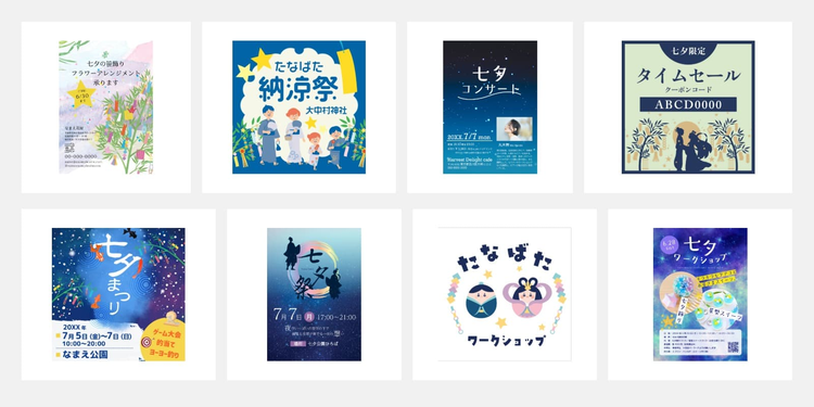 七夕向けのイラスト素材やテンプレートが豊富に揃っており、配置や色、テキストを調整するだけで七夕らしい雰囲気のデザインが手軽に仕上がります。