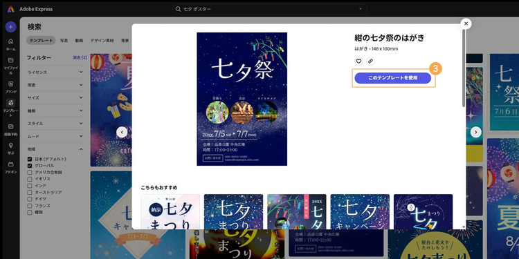 このようにAdobe Expressには、七夕向けの素材やテンプレートが豊富なので、作りたいデザインのイメージに合うものが見つかるはずです。