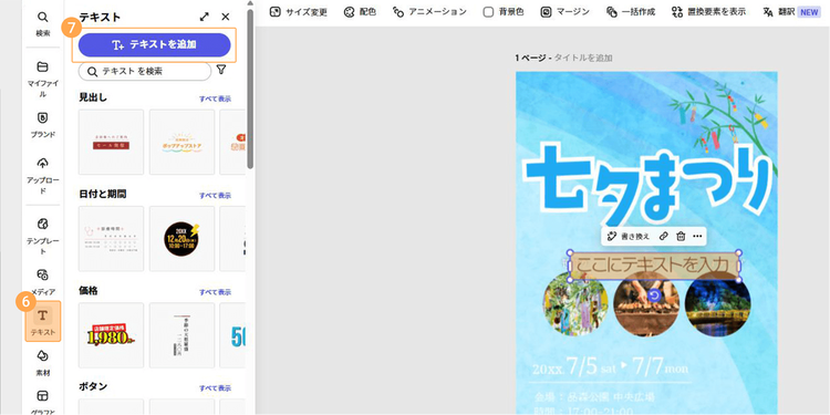 ツールバーの「テンプレート」をクリックし、検索窓に「七夕 ポスター」「七夕 デザイン」など、作りたいデザインに合うワードを入力しましょう。
