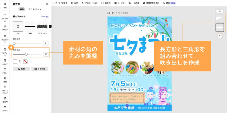 長方形は「編集」>「角の丸み」スライダーを使えば、角の丸みを調整できます。