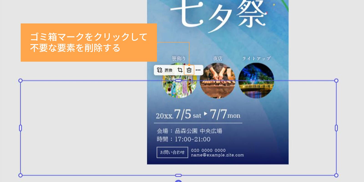 不要な要素(今回は背景のネイビーやグレーの素材)がある場合は、選択して「ゴミ箱」マークをクリックし、削除します。