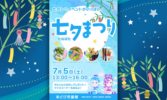 イベント名や日程などを変更したり、イラスト素材や背景を変えたりするだけで、目的や用途に合わせた七夕のイメージをカンタンに作れます。