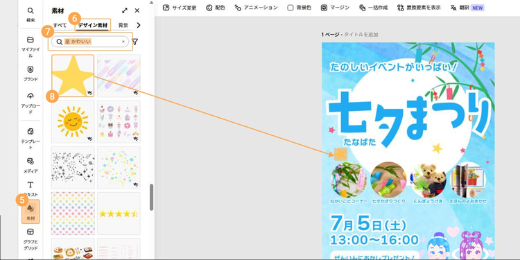 なお、イベント名の周りにちりばめた星の素材は、「素材」>「デザイン素材」をクリックし、「星 かわいい」と検索して追加しています。