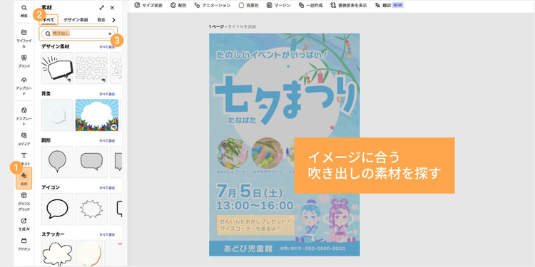 イメージに合う吹き出しの素材を探したいときは、「素材」から「すべて」や「デザイン素材」、「図形」などをクリックし、「吹き出し」で検索しましょう。
