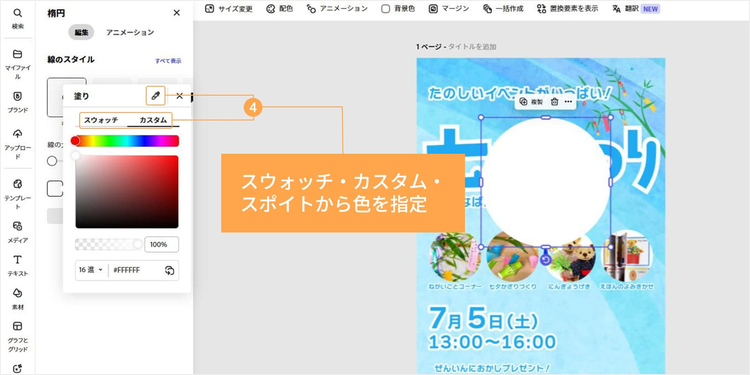今回は、イベント名の背景に円形の素材を追加して、テキストを引き立たせます。