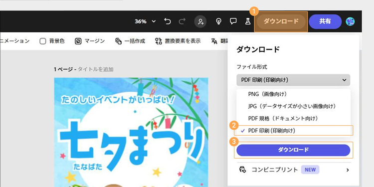 ポスターのデザインが完成したら、ダウンロードしましょう。