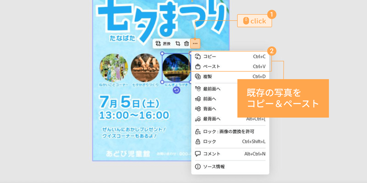 テンプレート上で写真の枠を増やしたい場合は、既存の枠を選び、「…(その他)」ボタンをクリックして表示されるプルダウンメニューから、「コピー」を選び、続けて「ペースト」してください。