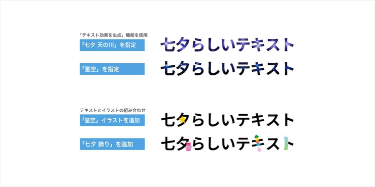 さらに、Adobe Expressの「テキスト効果を生成」を使えば、「七夕 天の川」や「星空」などと指定して、文字自体に星や天の川のイメージを反映できます。