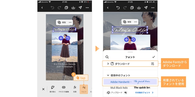 テキストを編集し「フォント」をタップすると、フォントを変更できます。Adobe Expressに最初から用意されているフォントだけでなく、Adobe Fontsから好きなフォントをダウンロードして使用することも可能です。