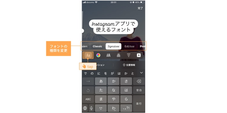 それでは続いて、投稿画像や動画に載せる文字の「フォント」の変え方についてご説明します。