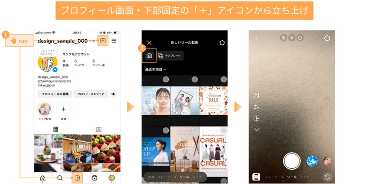 リールの撮影画面は、以下のいずれかの方法で立ち上げられます。