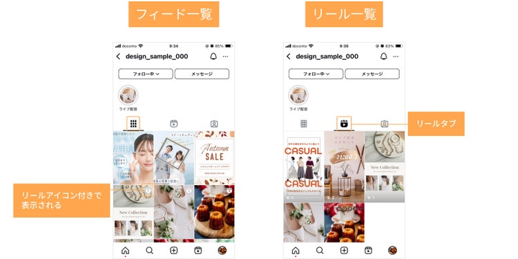 プロフィールページのリール一覧およびフィード一覧