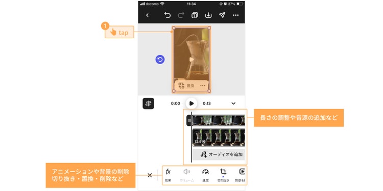 動画の構成が決まったら、編集画面で見た目を調整しましょう。