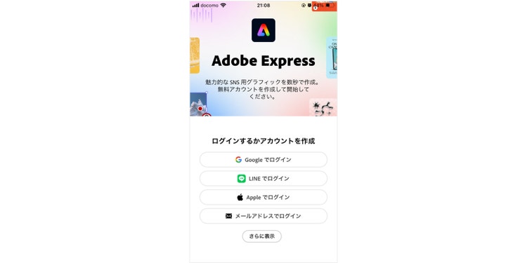 インストールするとログイン画面が表示されるので、おもちのGoogleアカウントやSNSアカウント、メールアドレスを使ってAdobe Expressに無料ログインしてください。登録は30秒ほどで完了します。