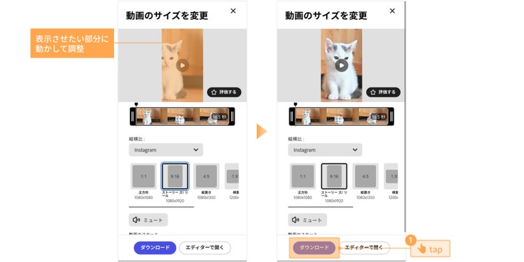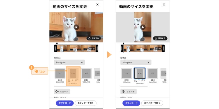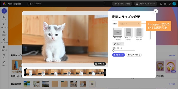 画像・動画編集ツール「Adobe Express 」では、Instagramの投稿の種類別に動画をカンタンにリサイズできます。