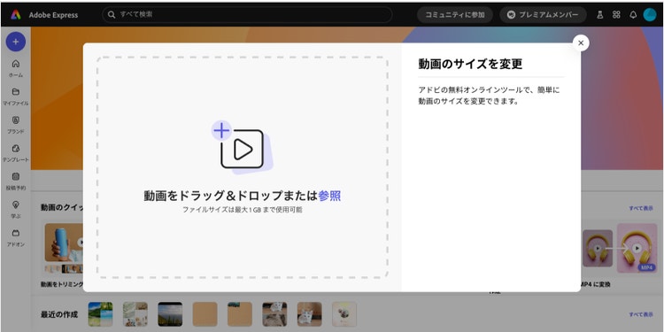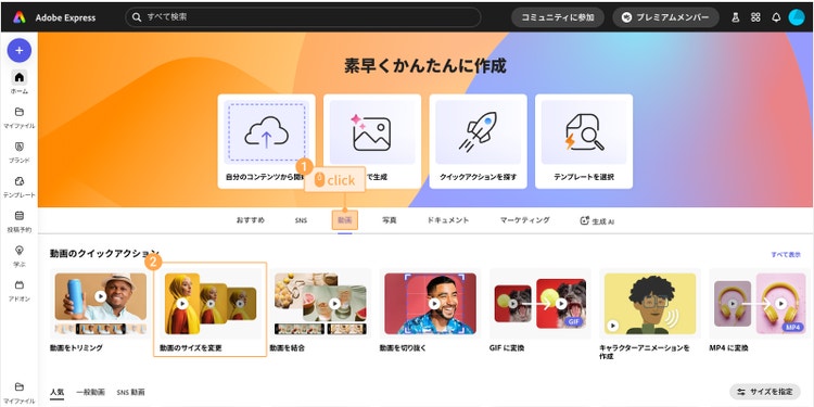 Adobe Expressの「クイックアクション」を使うと、リサイズしたい動画をアップロードし、変更したいサイズを選ぶだけでリサイズできます。