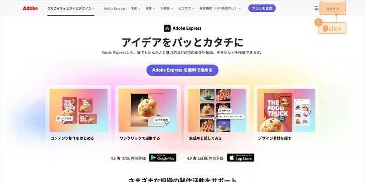 以下のAdobe Expressページにアクセスし、無料で会員登録とログインを行ってください。登録は30秒ほどで完了します。