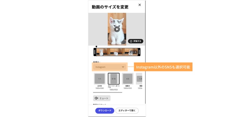 これで動画のリサイズは完了です。ちなみに、Instagram以外にもTwitterやYouTube、FacebookといったSNS用にもすぐにリサイズできます。「カスタム」で数値指定をしてリサイズすることも可能です。